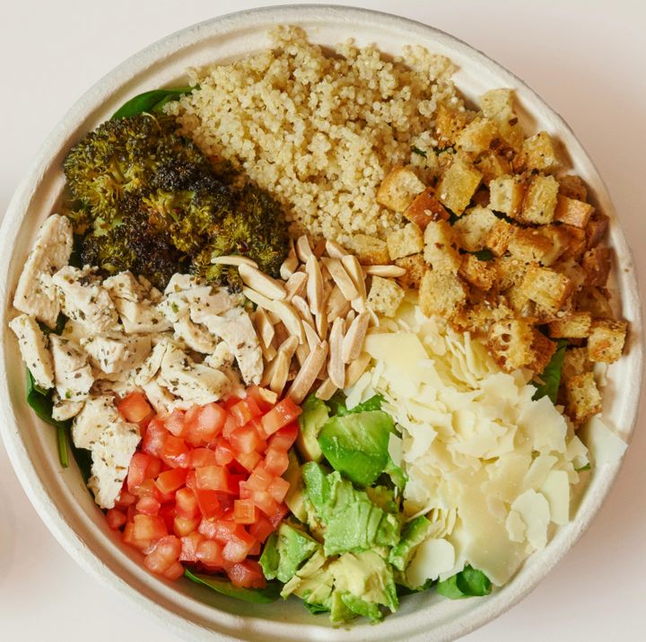 Baby spinach and quinoa with herb-roasted chicken, spicy charred broccoli, avocado, tomatoes, shaved parmesan cheese, and almonds —in our house-made pesto vinaigrette and finished with a bold kick of SOMA Spice.