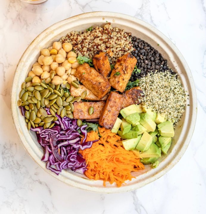 Kale, quinoa, roasted tofu, chickpeas, purple cabbage, shredded carrots, avocado, hemp seeds, pumpkin seeds, and our house made sesame ginger dressing. ( V)