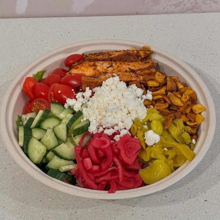 Romaine, quinoa, blackened chicken, cherry tomato, cucumber, pickled onions, banana peppers, feta, pita crisps, lemon herb vinaigrette
