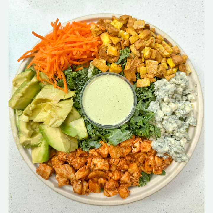 Romaine, brown rice, spicy chicken, avocado, carrots, blue cheese, pita crisps, house- made green goddess dressing