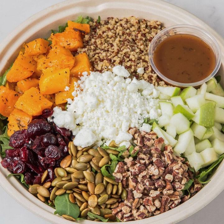 Arugula, quinoa, roasted sweet potato, crumbled goat cheese, Granny Smith apples, craisins , toasted pecans , and our house-made balsamic vinaigrette