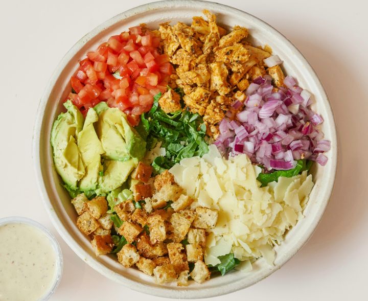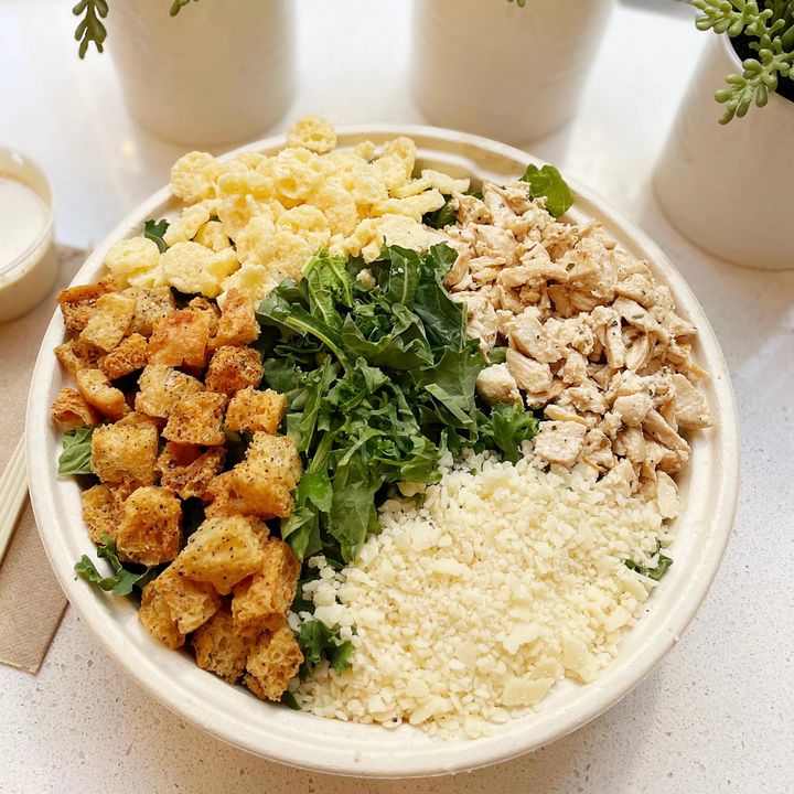 Kale, romaine with herb-roasted chicken, avocado, shaved Parmesan cheese, everything bagel croutons, and our house-made Caesar dressing.