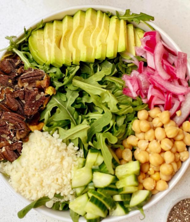 Arugula, chickpeas, cucumbers, avocado, pickled onions, parmesan, pecans, hemp seeds, house-made balsamic vinaigrette