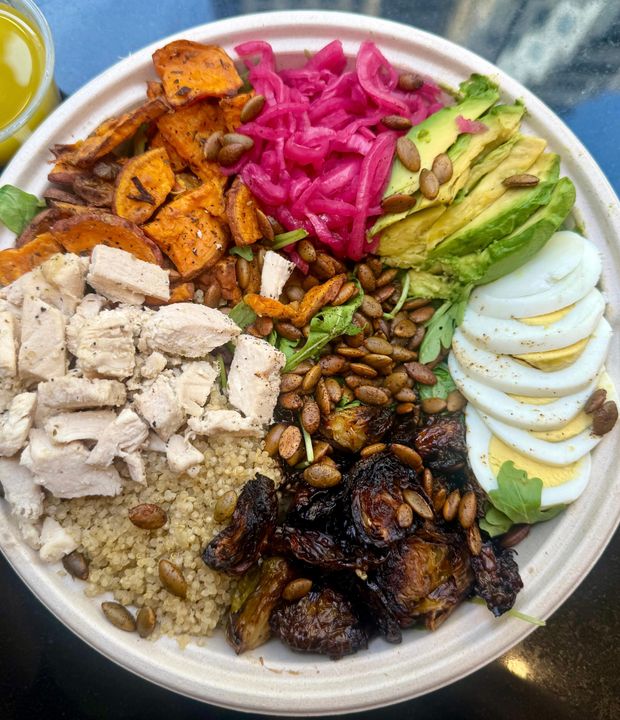 Arugula and quinoa topped with roasted chicken, roasted Brussels sprouts, sweet potato, avocado, hard-boiled egg, pickled onions, spiced pumpkin seeds, with fresh lemon, olive oil, sea salt, and oregano.