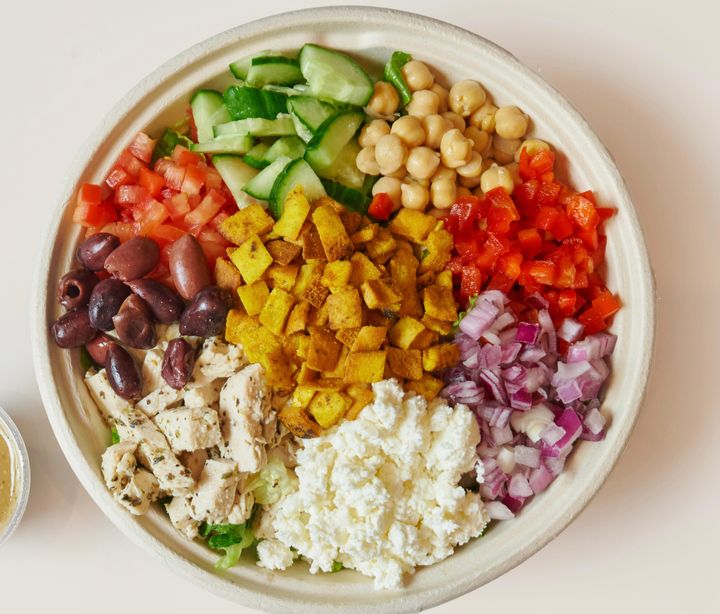 Romaine, herb-roasted chicken, English cucumbers, tomatoes, red peppers, chickpeas, kalamata olives, red onion, and crumbled feta cheese. pita crisps, and our house- made Greek dressing
