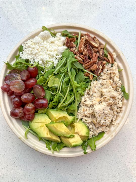 Arugula, roasted chicken, avocado, red seedless grapes toasted pecans, crumbled goat cheese, house-made balsamic vinaigrette dressing