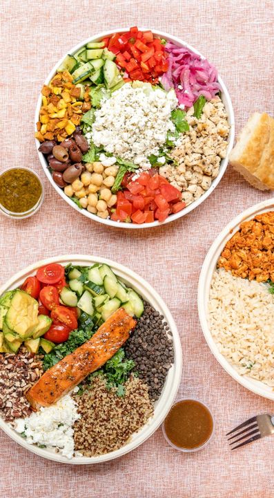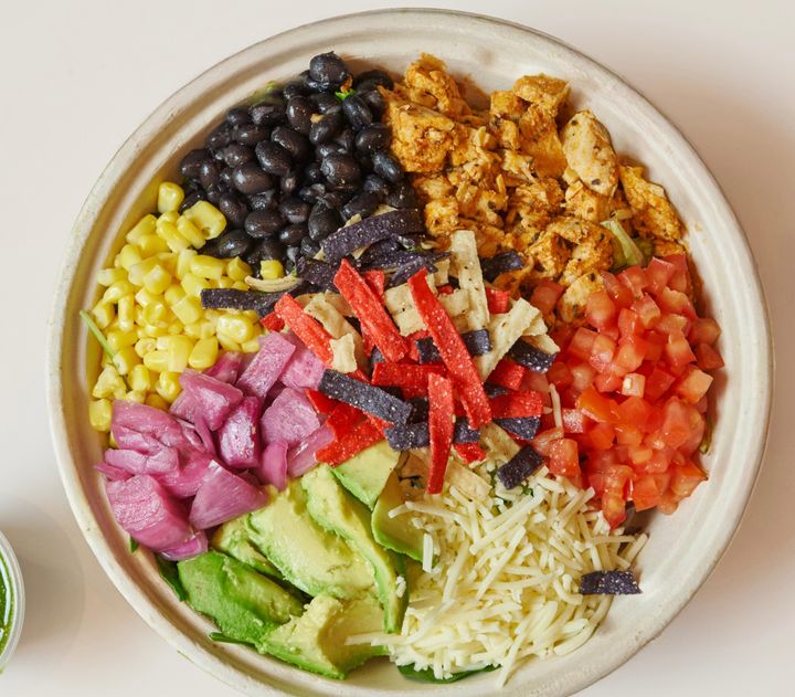 Spinach, brown rice, spicy roasted chicken, avocado, tomato, pickled onions, corn, cheddar cheese, pita crisps, lime cilantro jalapeńo dressing