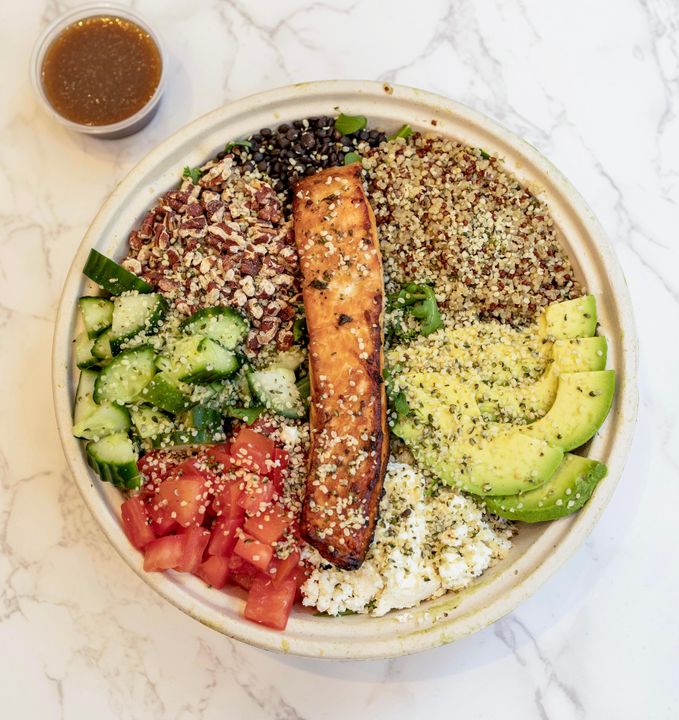Kale, quinoa, black lentils, herb roasted salmon, avocado, tomato, cucumber, toasted pecans, feta cheese, hemp seeds, house- made balsamic vinaigrette