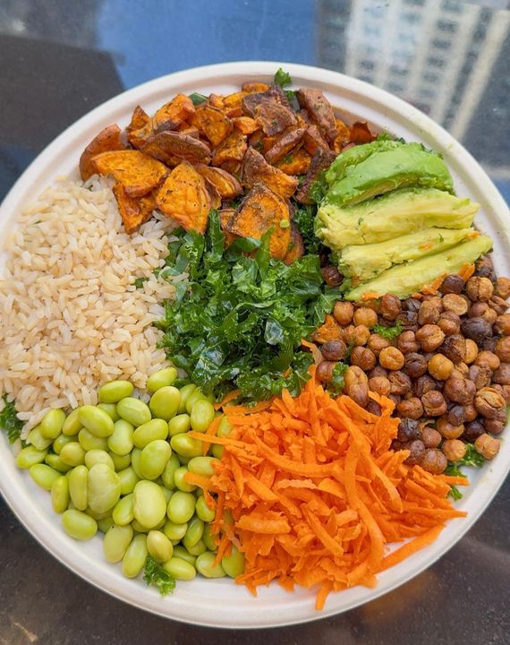 Brown rice, shredded kale, roasted sweet potato, avocado, carrots, edamame, crispy chickpeas, and out house made carrot-ginger dressing.