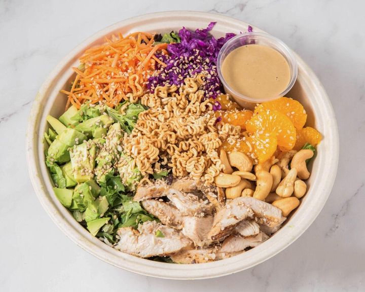 Mixed greens and romaine, herb-roasted chicken breast, avocado, shredded carrots, purple cabbage, sweet mandarin oranges, sesame seeds, cashews, ramen noodle crunch, and our house-made sesame ginger dressing.