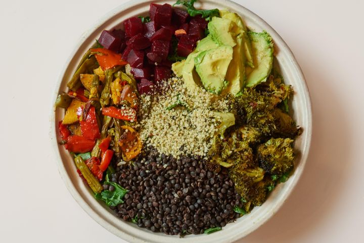 Kale, quinoa, roasted sweet potato, spicy charred broccoli, chickpeas, purple cabbage, avocado, almonds, hemp seeds, house-made harissa tahini